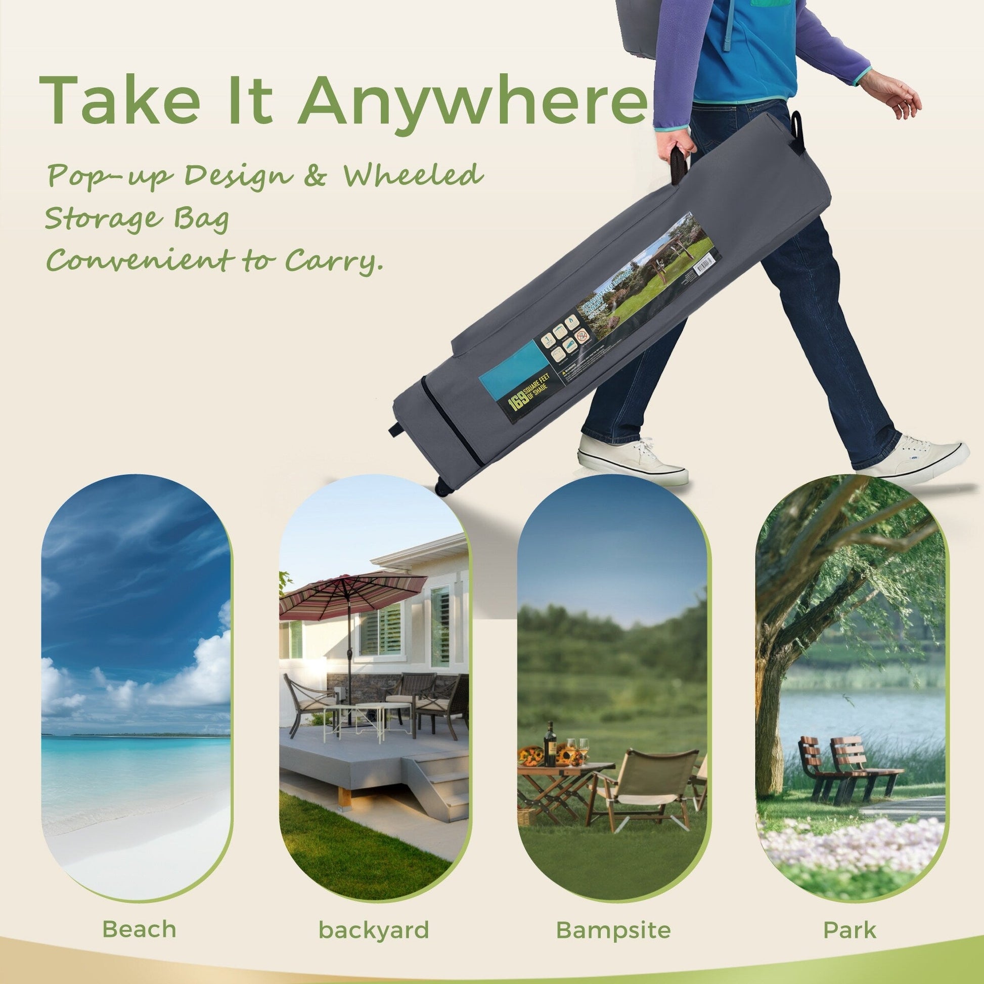 L'auvent pliant est fabriqué en acier et en fer. Sa structure est résistante à la rouille et thermolaquée, ce qui lui confère durabilité, robustesse et sécurité. Utilisez-le où vous le souhaitez. Pique-niques, fêtes, camping, activités au parc, marchés de producteurs, petites entreprises, etc., cet auvent sera parfait.