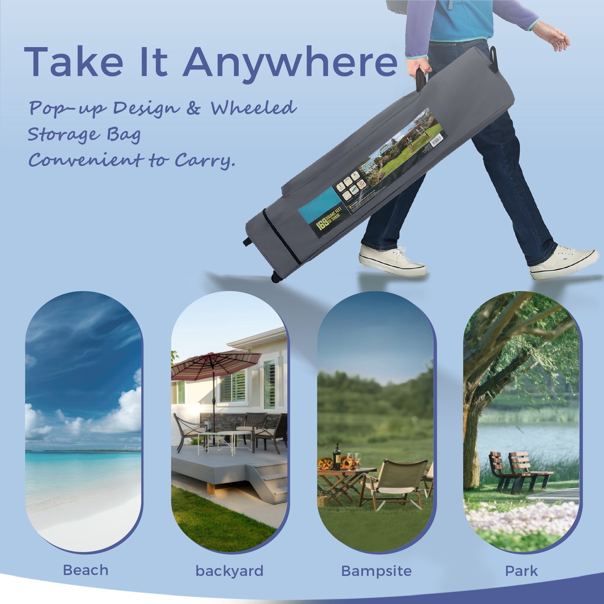 Accessoire : Sac à roulettes inclus pour un transport et un rangement faciles. N'oubliez pas de stabiliser la tente avec les haubans et les piquets inclus.