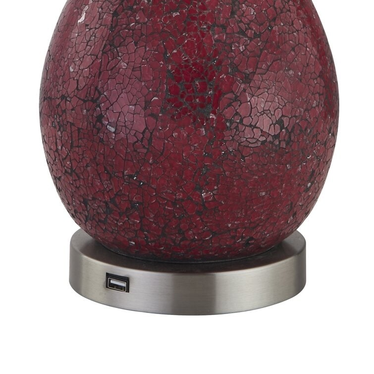 This 2-piece set of bedside table lamps light up your space with fun texture and boho flair. Both are crafted in teardrop shapes with a unique crackled effect that reminds us of mercury glass. The circular metal bases have built-in USB ports ideal for charging your phone or tablet while you're reading or watching TV. The simple drum shade and finial top allows the body of the lamp to really fantastic. Each lamp takes one standard bulb (Not included).