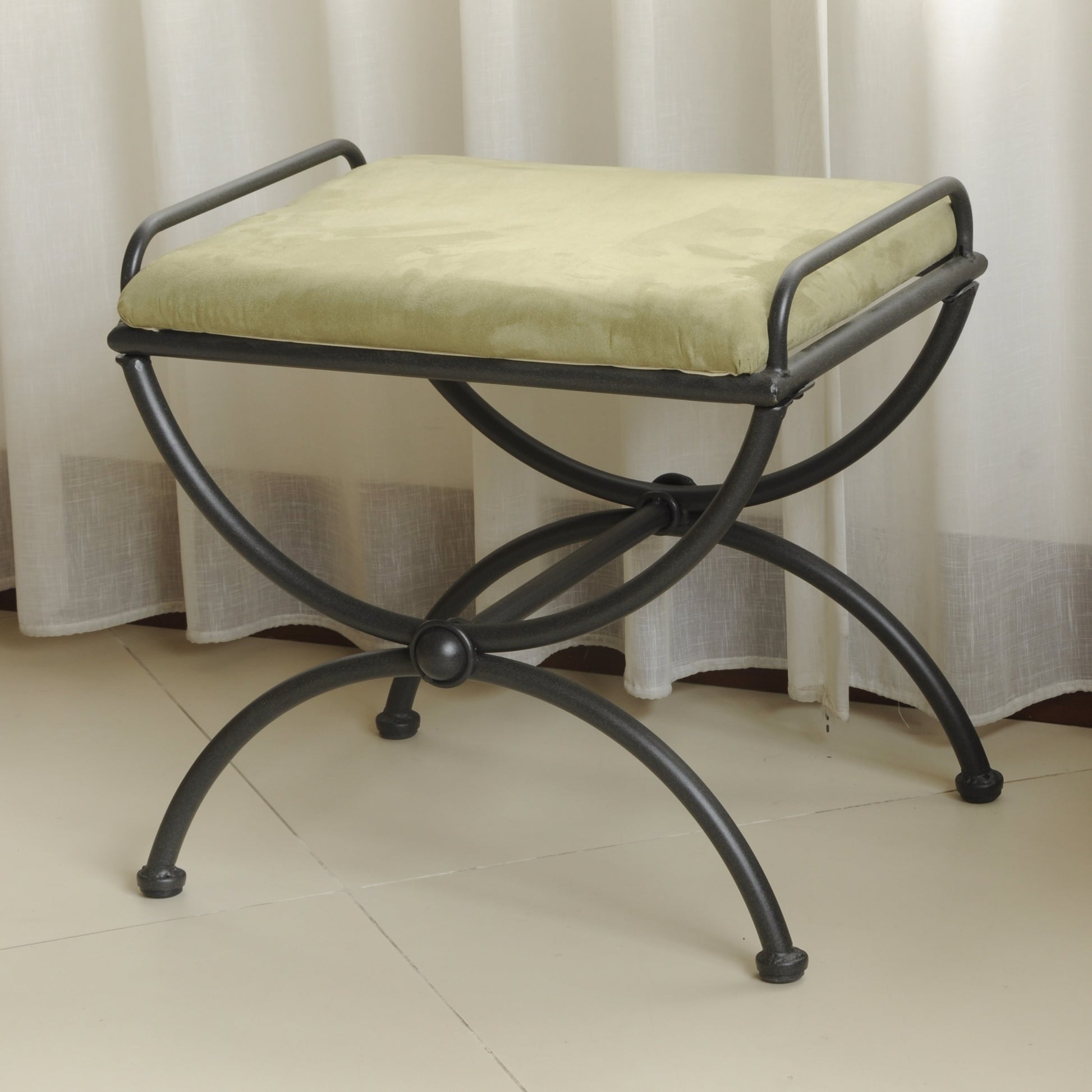 Add a touch of sophistication to your vanity area with the Cambridge Iron Vanity Bench by International Caravan. The elegant double-arched design of this bench, crafted from durable iron and finished with an antique black powder coat, exudes timeless style. The soft microsuede cushion, available in a variety of earth-toned colors, provides comfort and versatility.