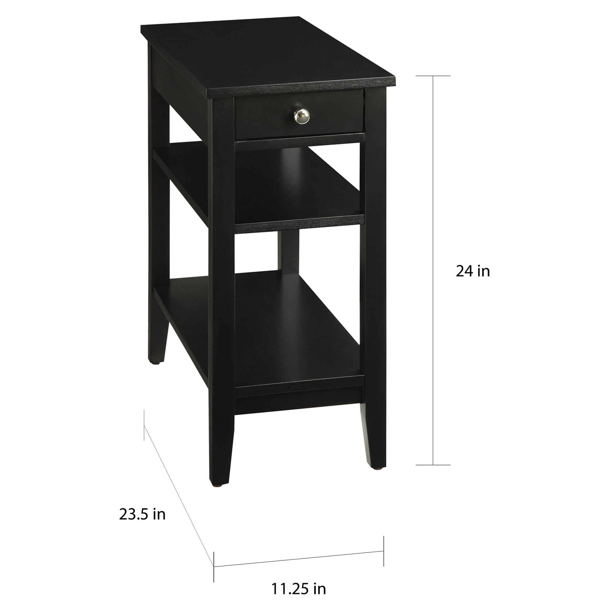 Classic yet simple in style; the American Heritage 1 Drawer Chairside End Table with Shelves by Convenience Concepts brings interior design to a new level. Available in multiple finishes; this transitional versatile chairside table is sure to upgrade any living space. The classic design of this beautiful piece also includes three spacious tiers of shelving for decor or family room necessities. A smooth nickel drawer knob on the pull-out drawer allows for easy access to concealed entertainment essentials. Built from manufactured wood and solid wood; this unit is sure to stand the test of time. This side table is complete with a smooth non-lead-based paint finish. Shop and style your favorite living space with beautiful coordinating pieces from the American Heritage Collection by Convenience Concepts; each sold separately.