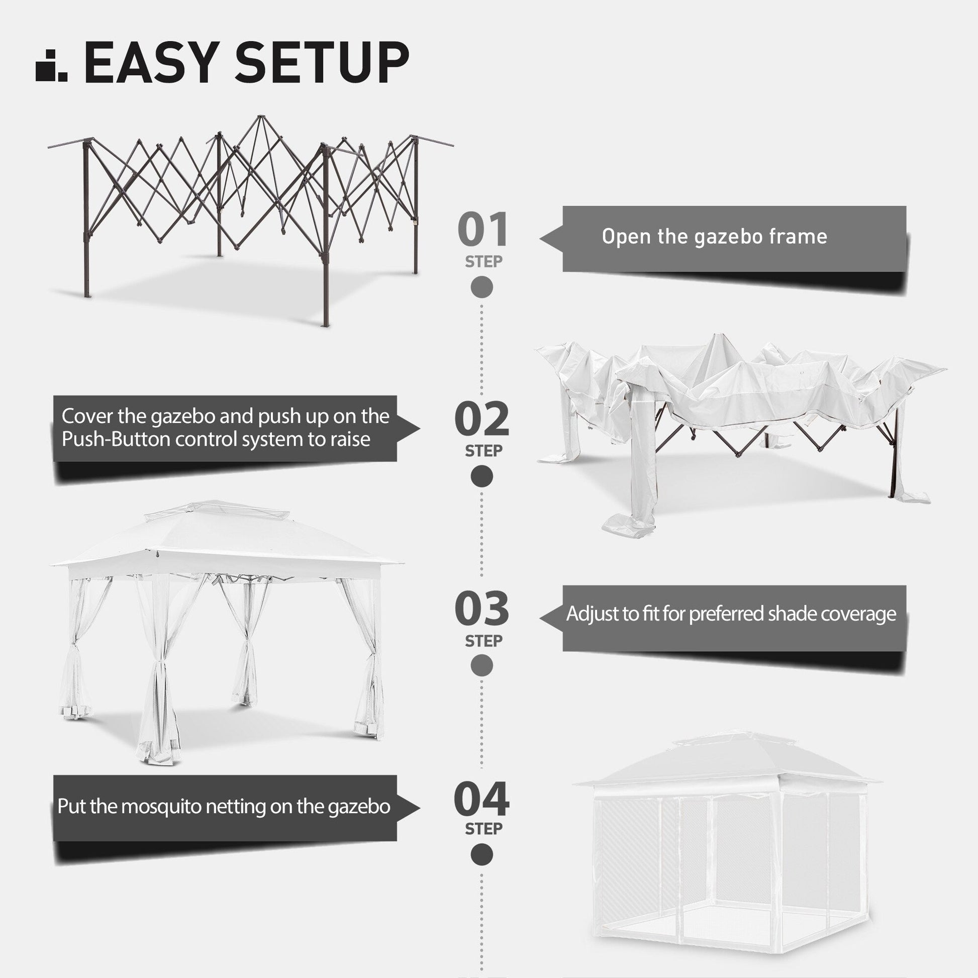 - PAROIS LATÉRALES MULTIPLES - La tonnelle COZYWOR est dotée de parois latérales en filet à fermeture éclair qui offrent une intimité idéale et protègent des insectes. Grâce aux anneaux inclus dans la boîte, vous pouvez facilement fixer les parois latérales à la structure et profiter de vos moments en plein air en toute tranquillité.
