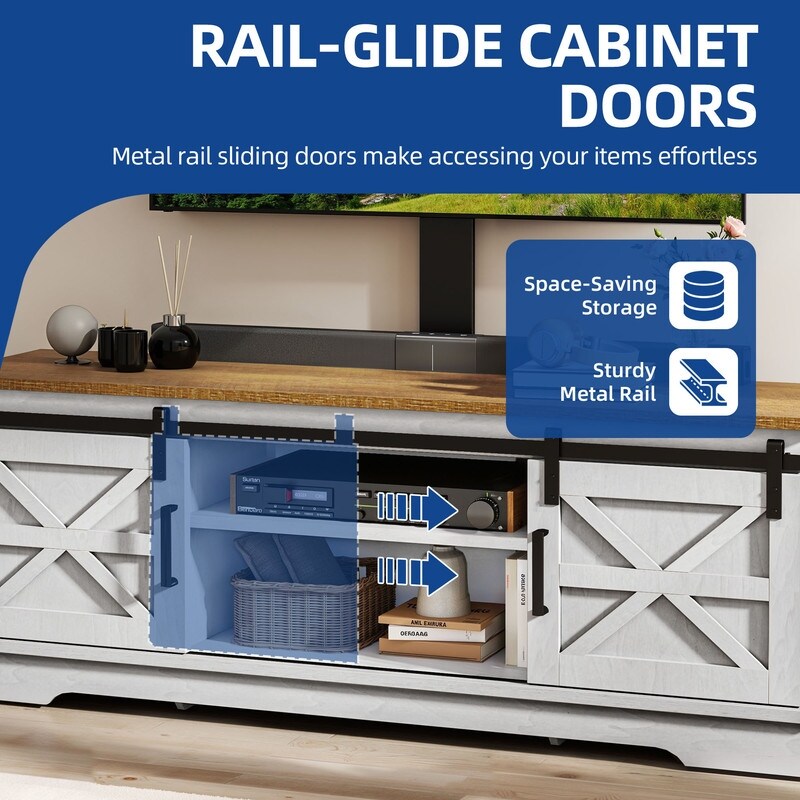 Meuble TV Farmhouse pouvant accueillir jusqu'à 65 téléviseurs avec portes et étagères ouvertes Console multimédia Prise de courant