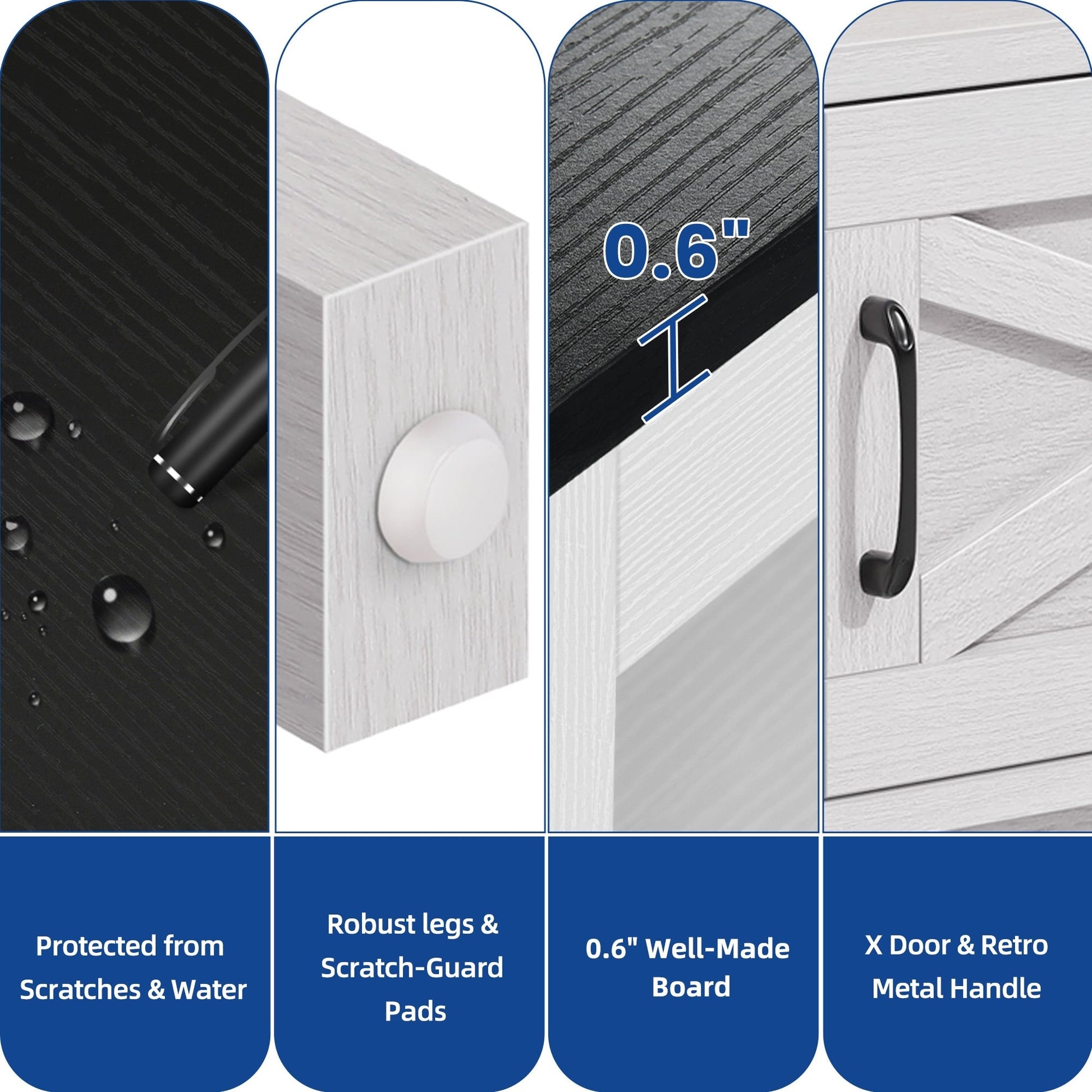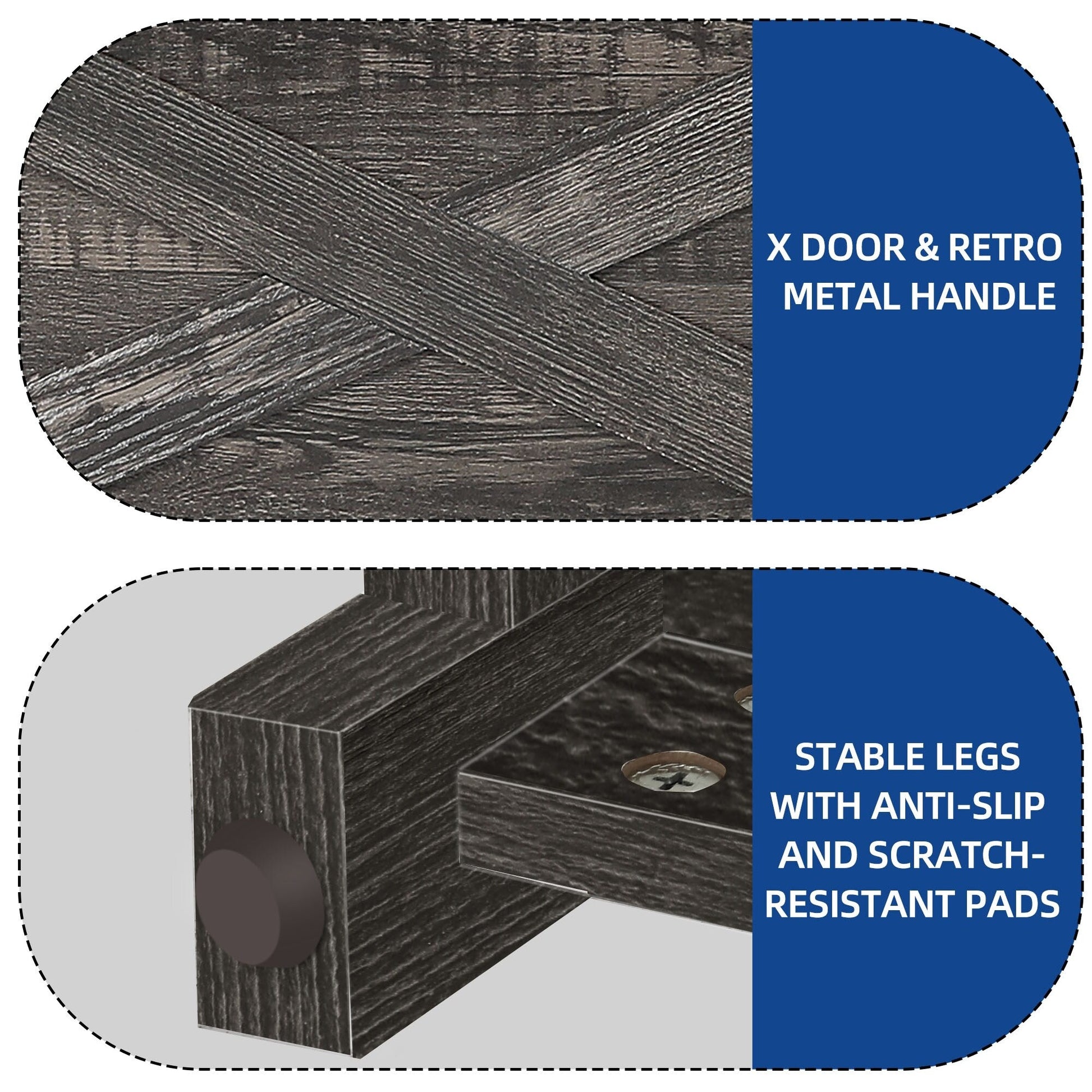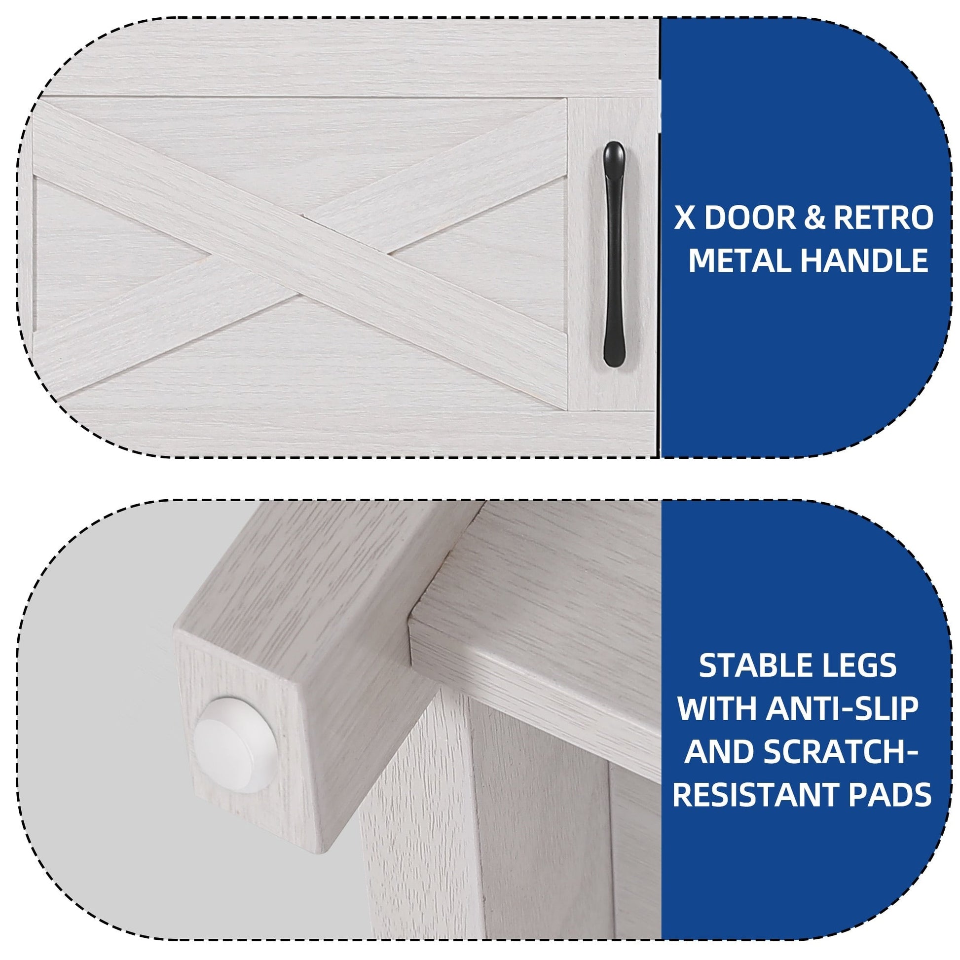 - 1. Design double X : Le design classique en X des deux côtés rehausse le style décoratif. Les poignées en acier et les portes à charnières permettent un accès facile aux objets, sans oscillation ni frottement.