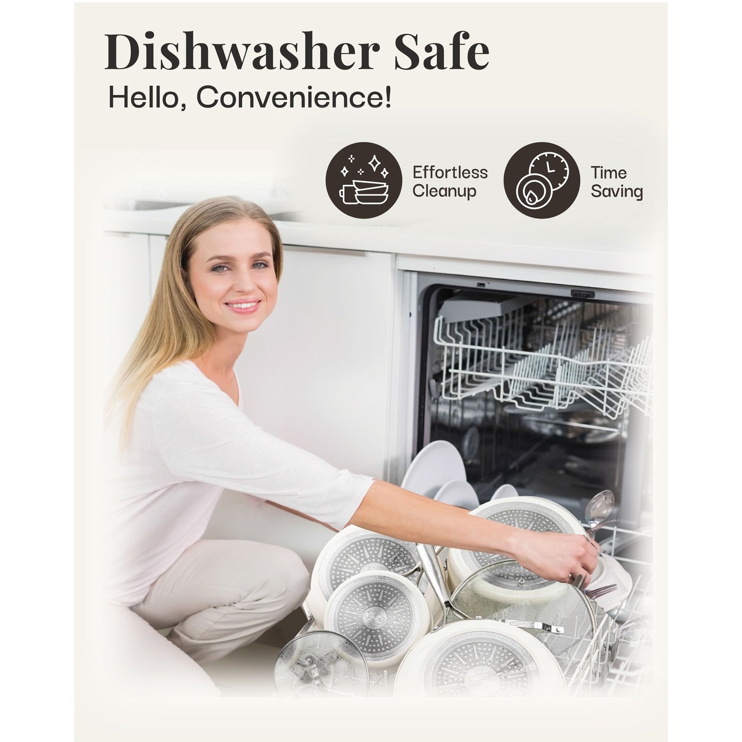 - Technologie antiadhésive avancée : Doté d'un revêtement Ti-Ceramic renforcé de diamants, cet ensemble de batterie de cuisine permet aux aliments de glisser sans effort, favorisant une cuisson plus saine avec un nettoyage minimal.