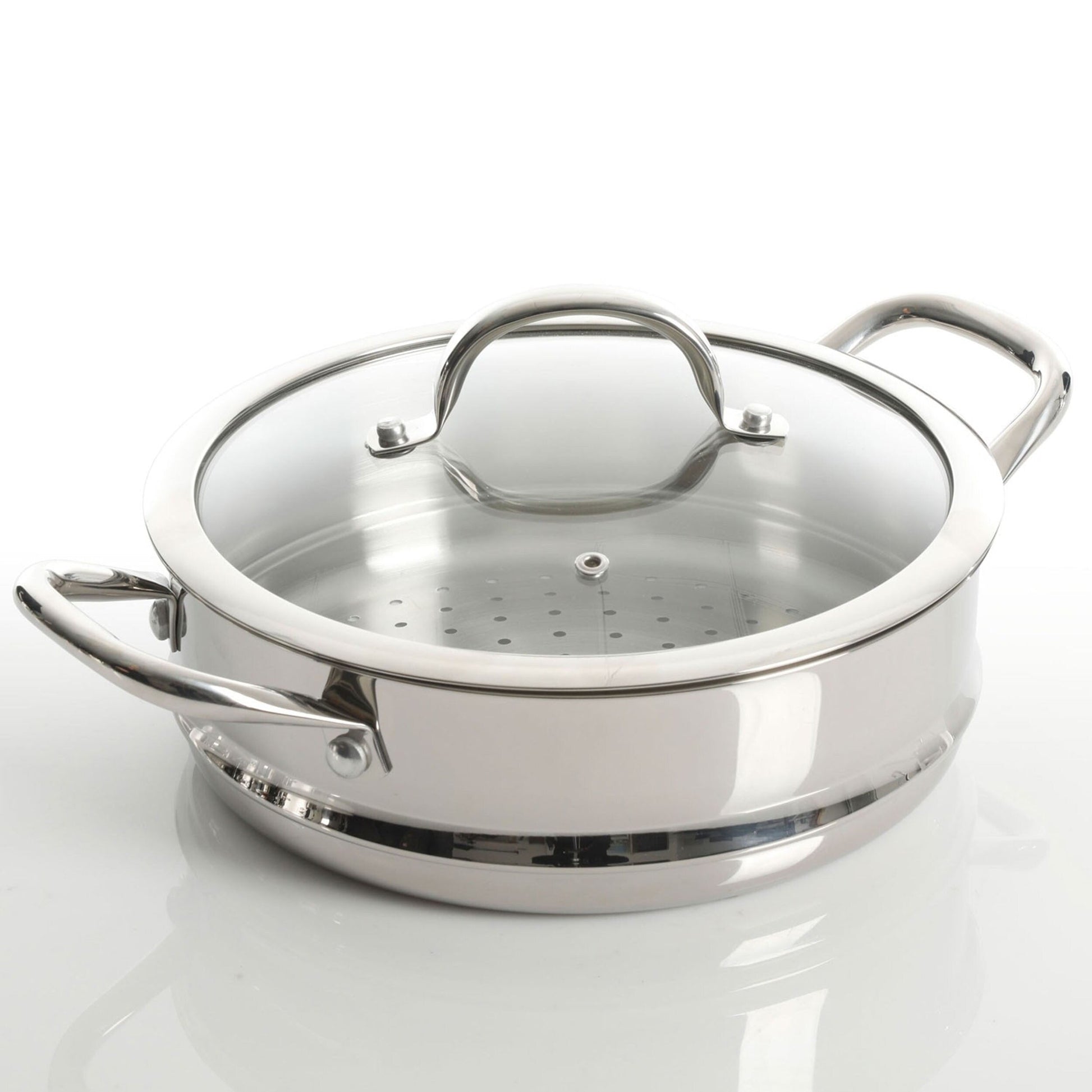 Cuisinez et créez vos plats les plus originaux avec cette batterie de cuisine 10 pièces en acier inoxydable épais. Fournissant tout le nécessaire, cette batterie de cuisine permet aux chefs de tous niveaux de frire, sauter, saisir, cuire à la vapeur, bouillir et cuire au four. Leur corps en acier inoxydable épais est compatible avec toutes les plaques de cuisson. La cocotte et les poêles sont équipées de couvercles en verre résistant à la chaleur avec évents pour une surveillance facile de la cuisson ! Cuire des légumes à la vapeur, faire sauter des nouilles, faire frire du poulet, remuer des sauces tomates savoureuses et plus encore. Ensemble : Batterie de cuisine Matériau : acier inoxydable épais Finition : polie Poignées : acier inoxydable Compatible avec toutes les plaques de cuisson Lavage à la main uniquement L'ensemble comprend : Une casserole de 1 pinte avec poignée et couvercle de 6,25 pouces Une casserole de 2,5 pintes avec poignée et couvercle de 7 pouces Une poêle à frire de 9,5 pouces avec poignée de 7,25 pouces Un panier vapeur avec poignées de 2 pouces Une sauteuse de 4,4 pintes avec poignées de 8,5 pouces et 2 pouces et couvercle Une cocotte de 5 pintes avec poignées et couvercle de 2 pouces Dimensions par article : Casserole de 1 pinte : 12,25 pouces de longueur, 6 pouces de largeur, 3 pouces de hauteur, capacité de 1 pinte, poids de 1 lb Casserole de 2,5 pintes : 14,25 pouces de longueur, 7,75 pouces de largeur, 4 pouces de hauteur, capacité de 2,5 pintes, 1,75 lb Poêle à frire de 9,5 po : longueur de 17 po, largeur de 10 po, hauteur de 2,25 po, capacité de 48 oz, poids de 2 lb. Insert de cuisson à la vapeur : longueur de 14 po, largeur de 10 po, hauteur de 3 po, poids de 1 lb. Sauteuse de 4,4 pintes : longueur de 22 po, largeur de 11,5 po, hauteur de 3 po, capacité de 4,4 pintes, poids de 3,55 lb. Faitout de 5 pintes : longueur de 13,75 po, largeur de 10 po, hauteur de 4,5 po, capacité de 5 pintes, poids de 2,8 lb.