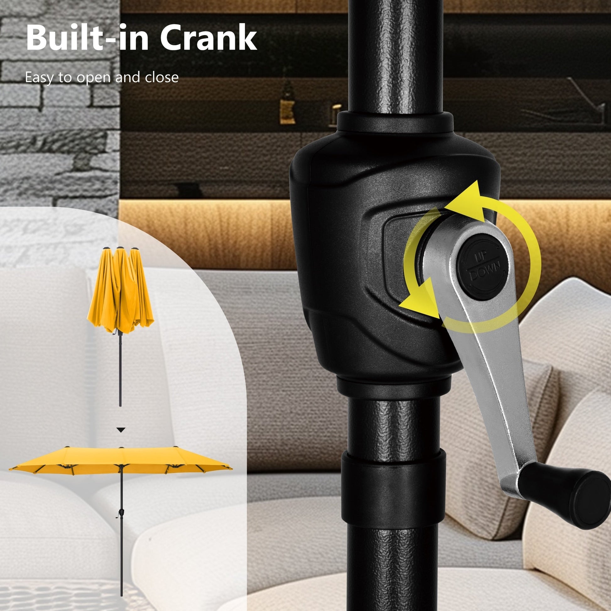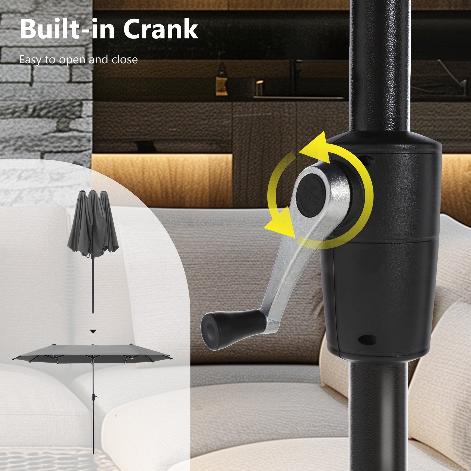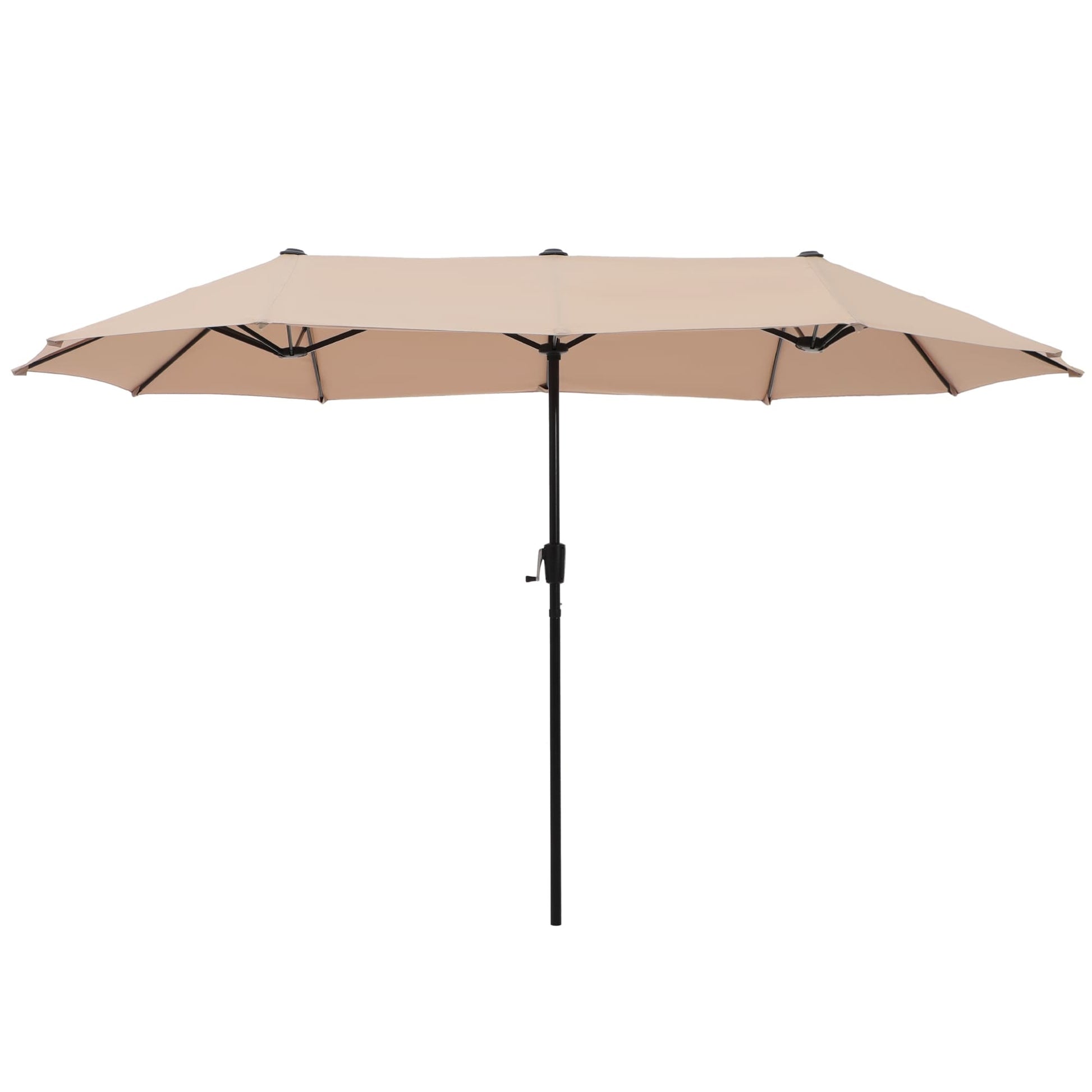 Stay cool and dry under the shade of our extra-large 13ft double-sided patio umbrella. Made with a rust-free steel pole and 12 heavy-duty steel ribs, this durable umbrella can withstand strong winds and block out harmful UV rays thanks to its fade-resistant and waterproof 100% polyester canopy. The smooth-turning crank allows for easy opening and closing, making it perfect for residential or commercial use. Enjoy the outdoors with your loved ones under the comfort of our patio double-sided umbrella.