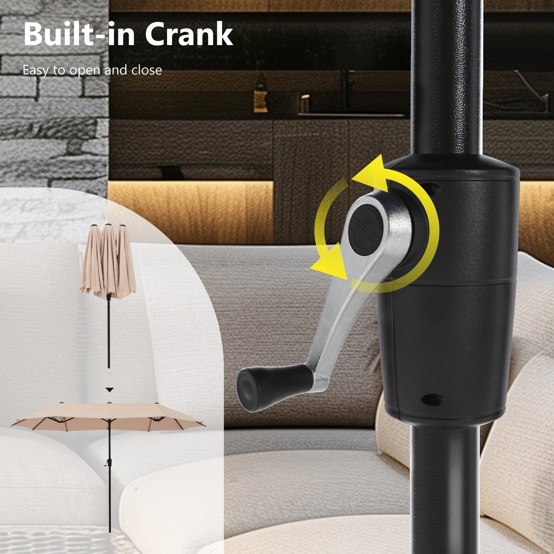- Opening mechanism: Crank open mechanism