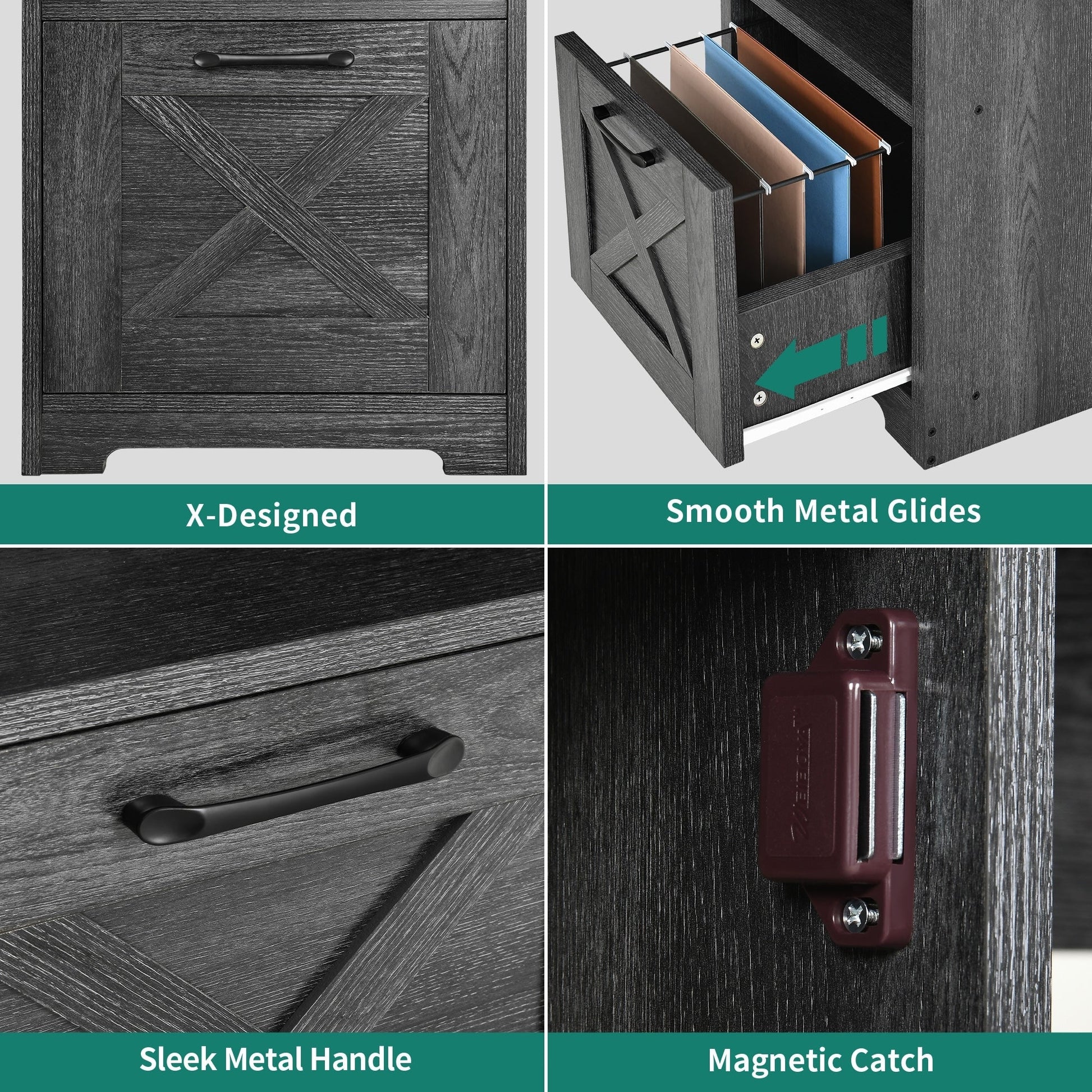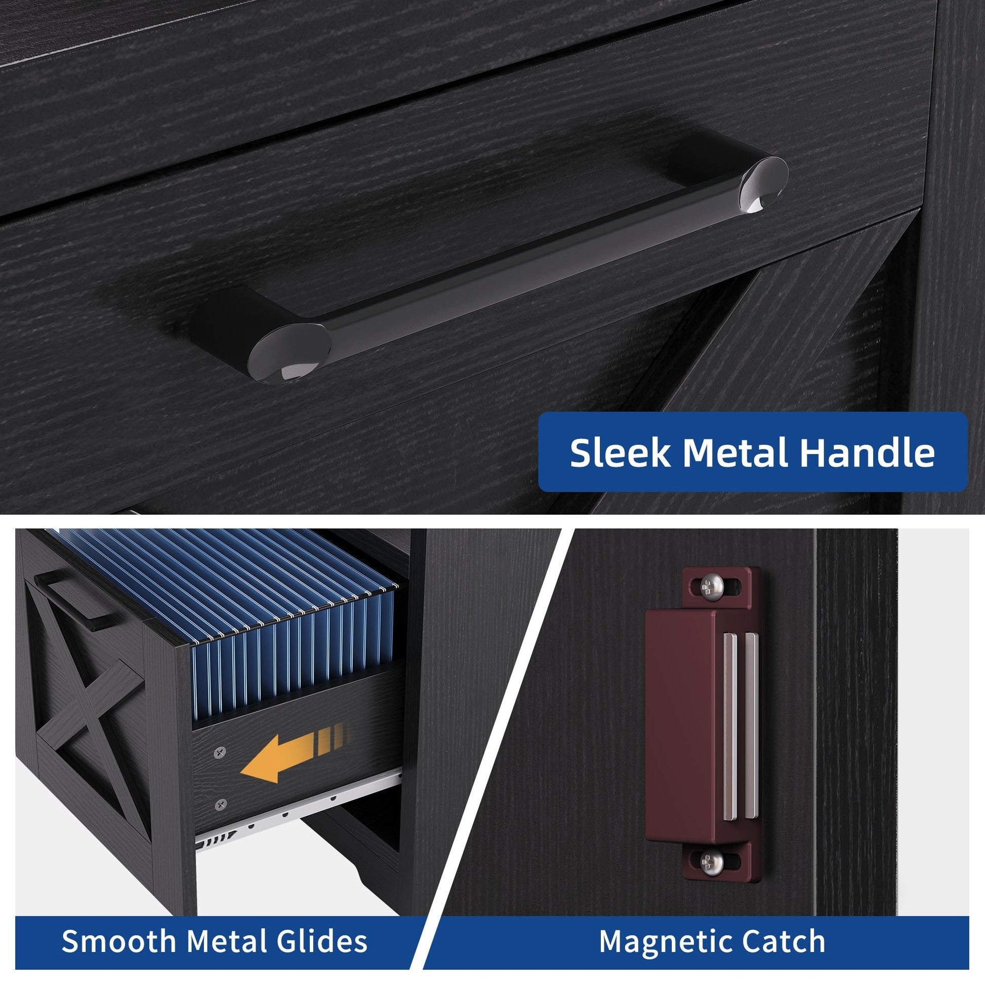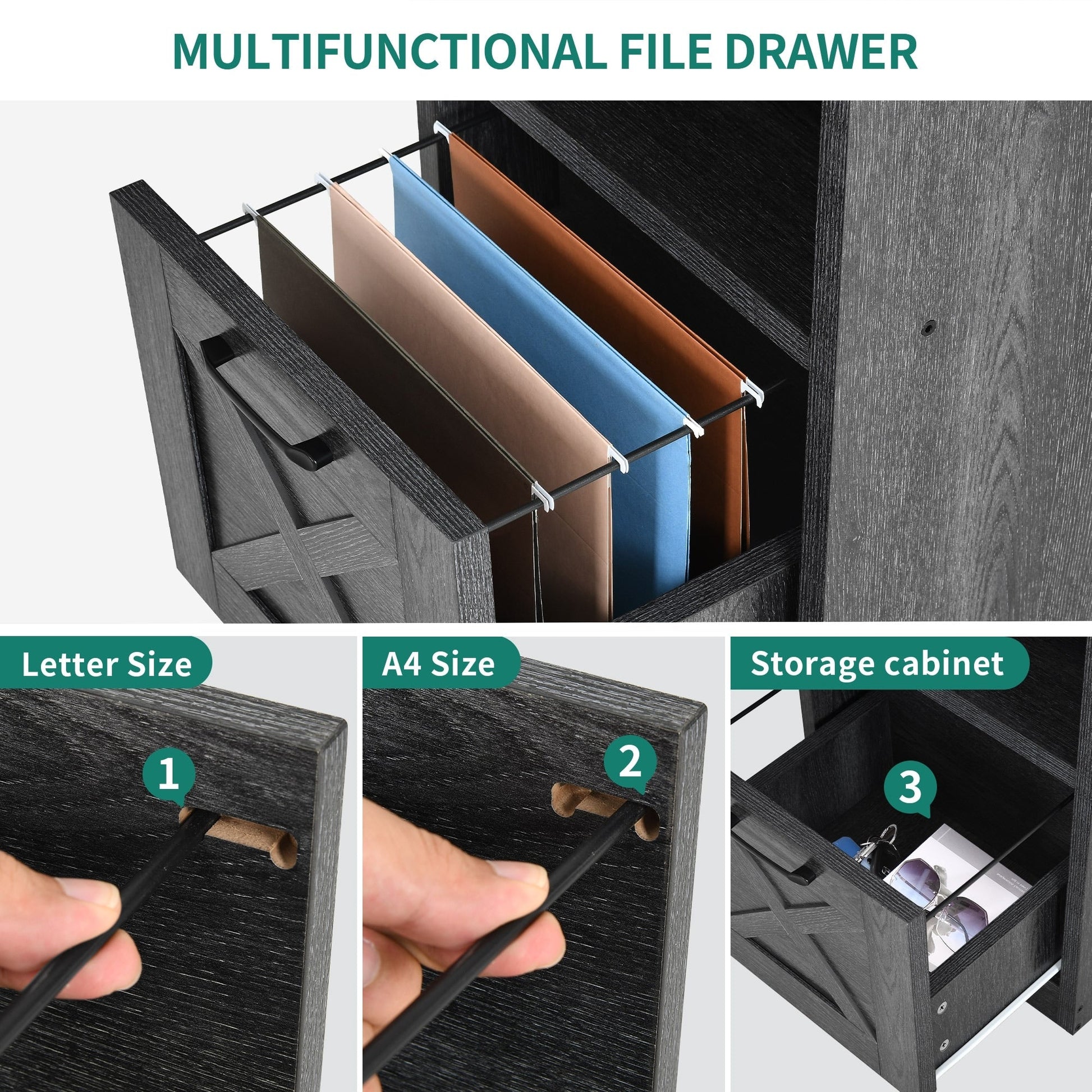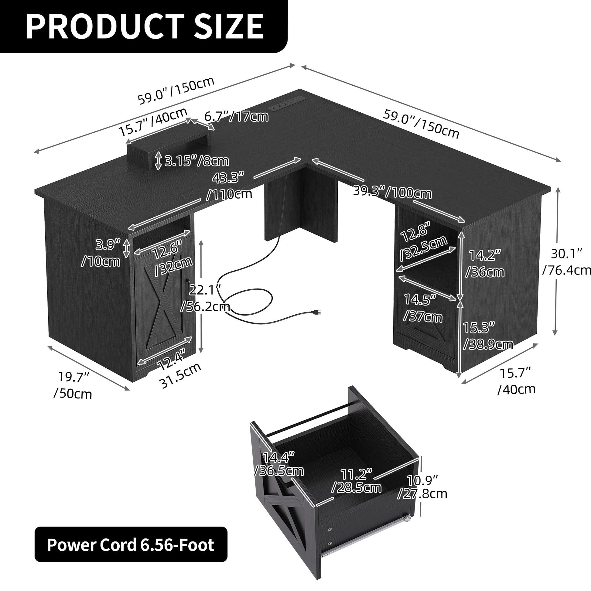 - 4. Organisez vos affaires et gagnez de la place avec ce bureau d'ordinateur en L. Il comprend un tiroir classeur avec barres de suspension réglables pour les documents au format Lettre/A4, une armoire de rangement et deux étagères ouvertes pour ranger livres, magazines, dossiers, lettres et autres fournitures.