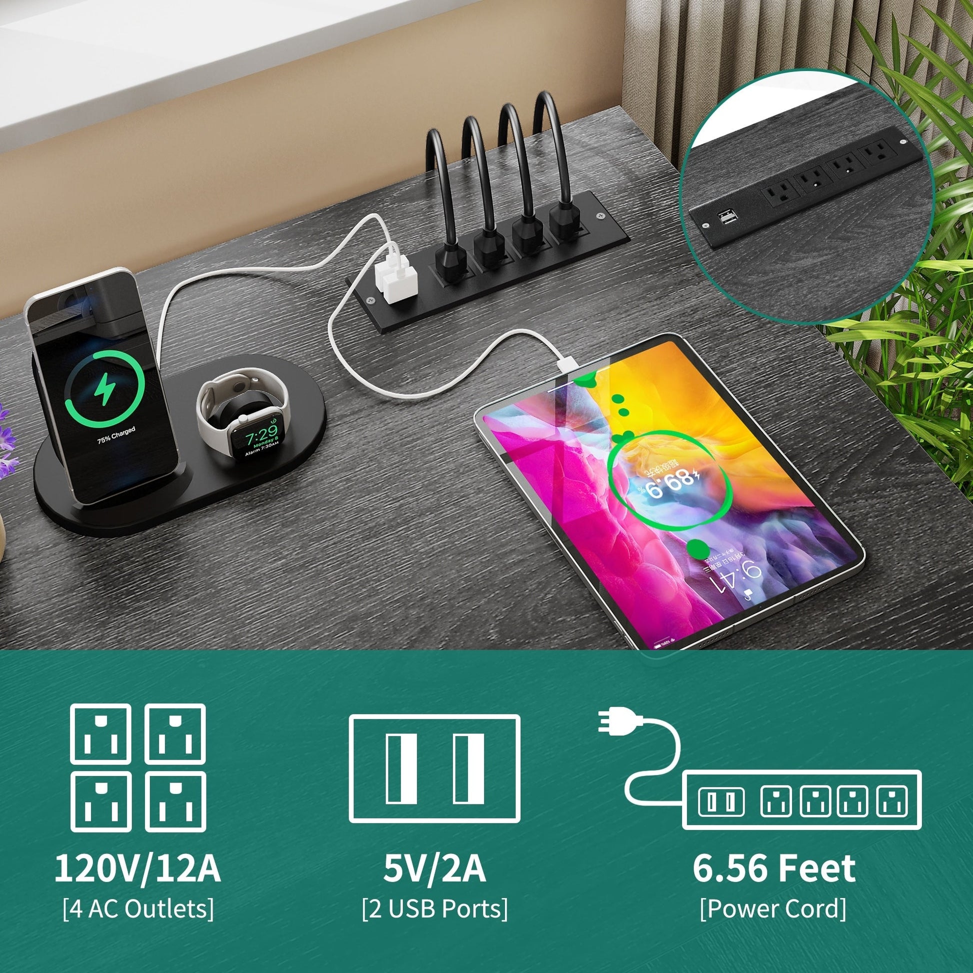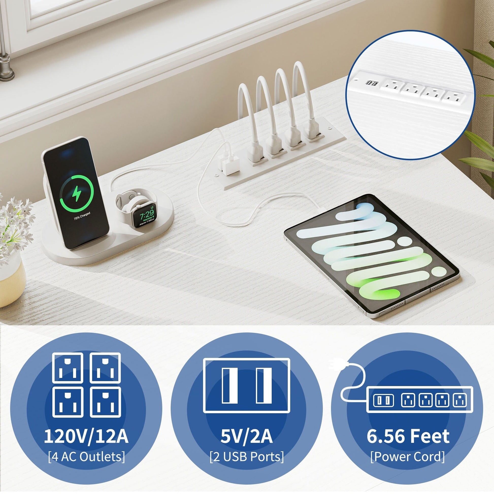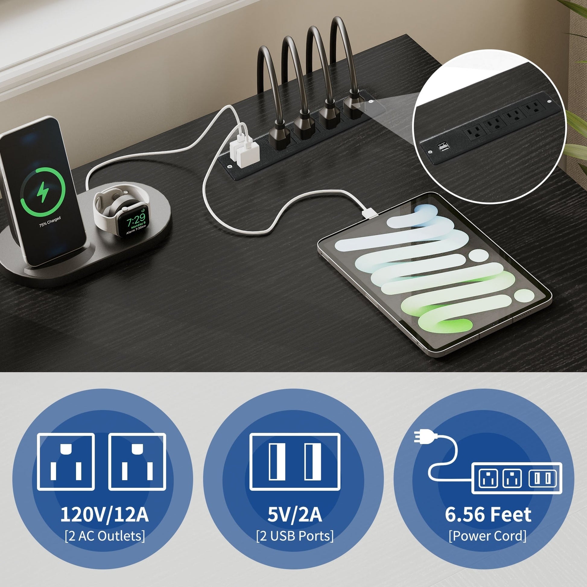 - 1. Rechargez vos appareils en toute simplicité grâce à ce bureau en L avec tiroirs. Il est équipé de 2 ports USB, de 4 prises de courant et d'un cordon d'alimentation de 2 m pour que votre ordinateur, ordinateur portable, téléphone, tablette, imprimante et console de jeu restent branchés et prêts à l'emploi.