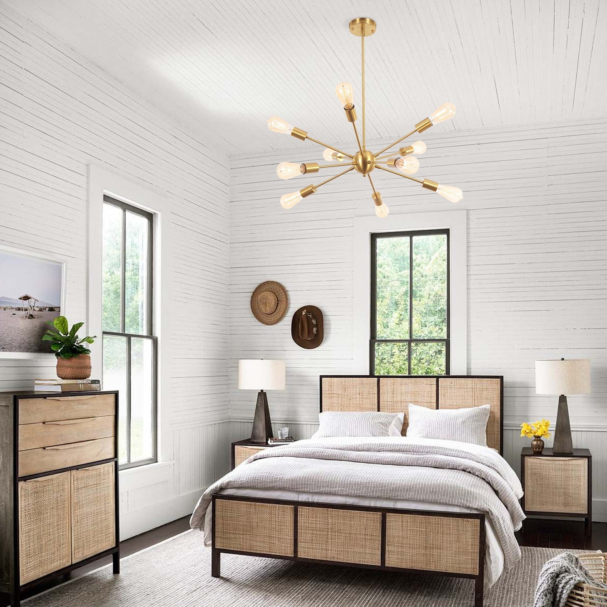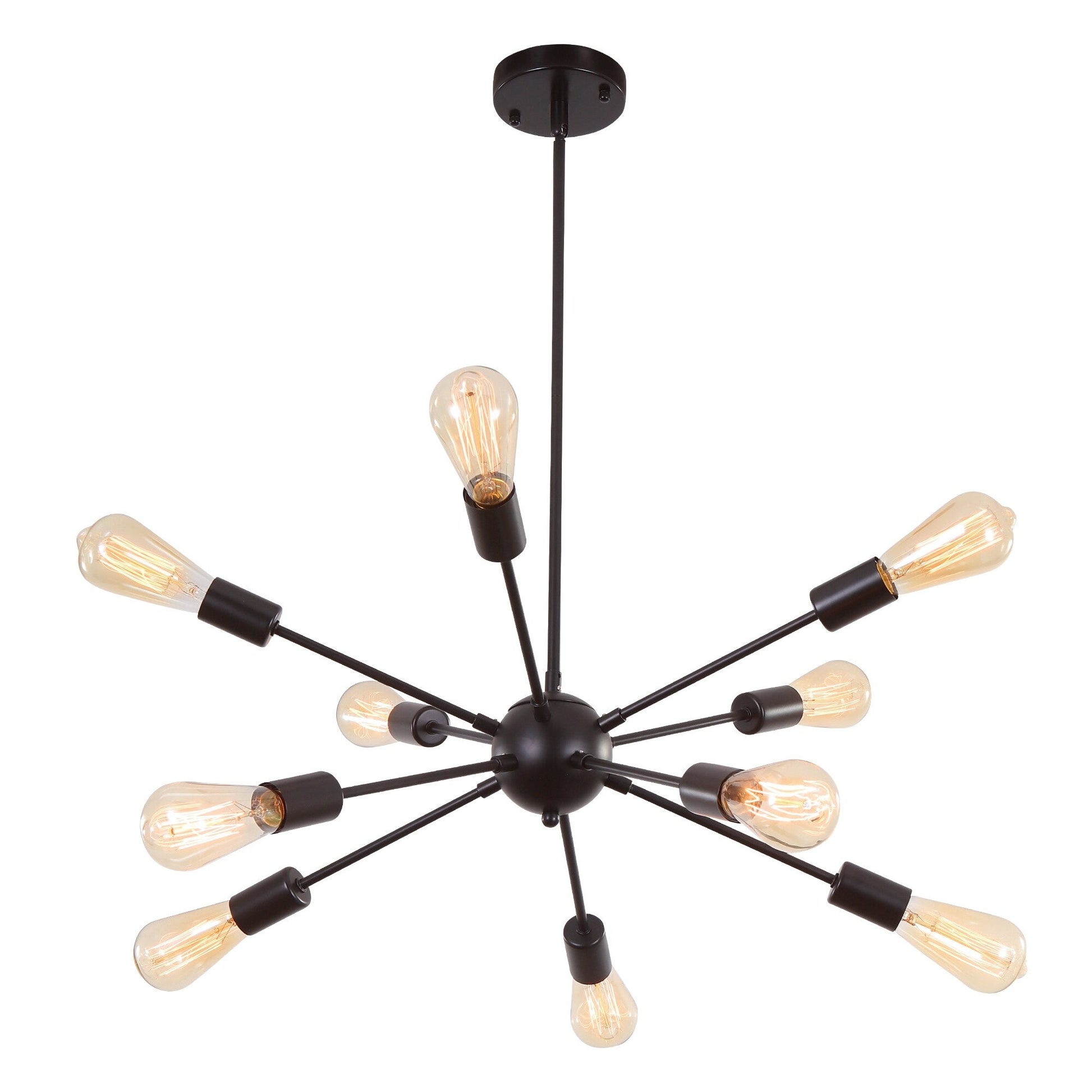 - 🏡Modern Mid century style Chandelier: Combined with modern style and Mid-Century style, this chandelier is arranged by 10 long and short arms, and emits a layered light overhead like a sun. The exposed bulbs bring an air of nostalgia for an older, more refined time.