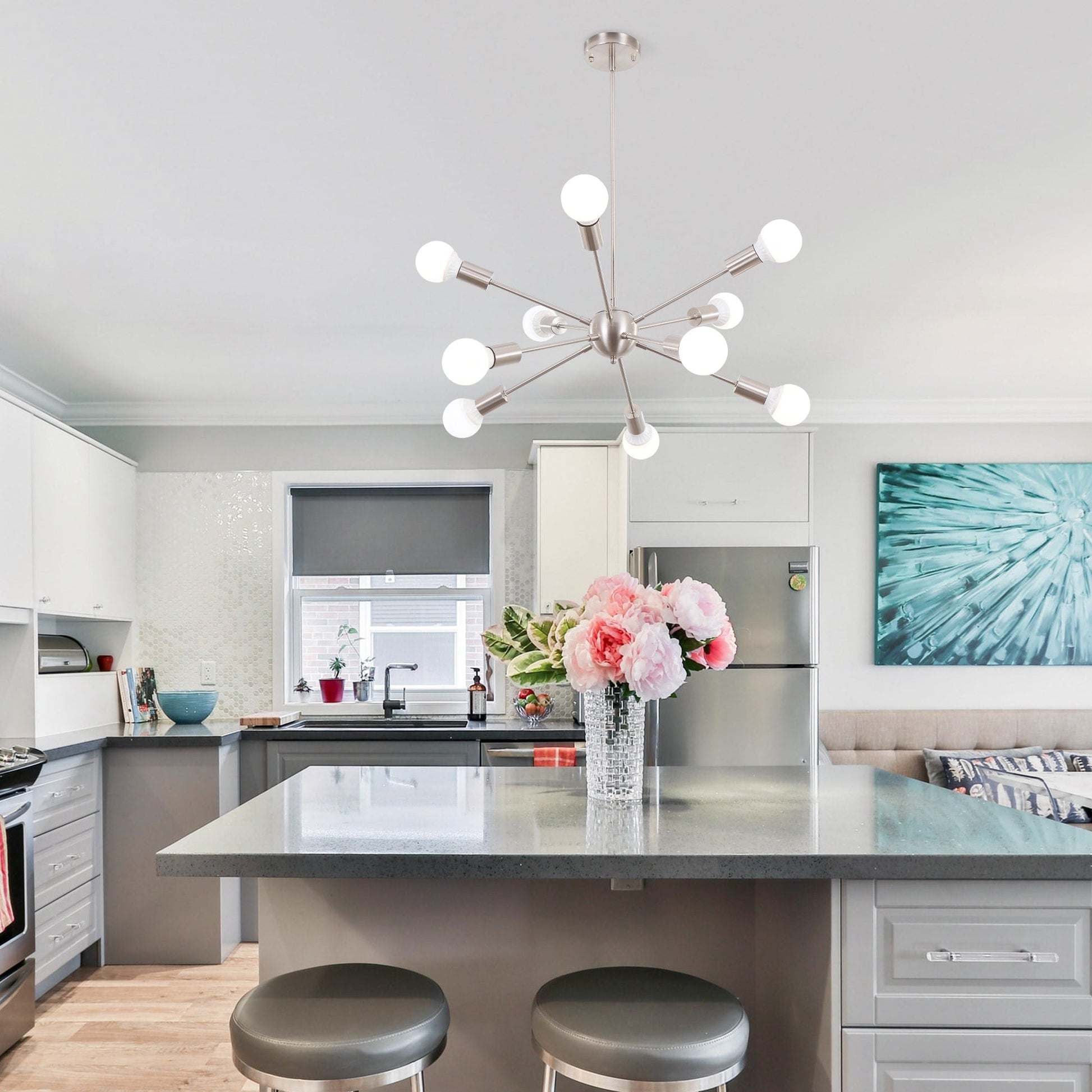 Illuminate your space with this modern style 10-light sputnik chandelier. Its sputnik design with 10 long and short arms and exposed bulbs is a perfect blend of mid-century elements and modern aesthetics, making it an ideal lighting option for any setting. Choose from black, sand nickel, or black+brass finishes to match your decor. Simple yet stylish design chandelier enough to light up your home and become the focal point of your home.