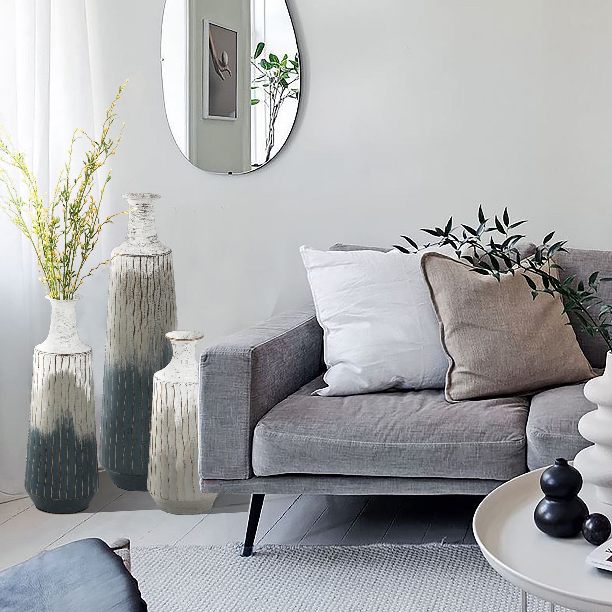 Ajoutez une touche d'élégance moderne à votre décoration avec cet ensemble de trois vases bouteilles en métal fabriqués à la main. Arborant un magnifique motif dégradé bleu, gris et blanc, rehaussé de touches dorées, ces vases s'intègrent parfaitement à n'importe quelle pièce. Leur forme fuselée et leur ouverture cannelée en forme de bouton apportent une touche unique à votre décoration, qu'elle soit posée au sol ou sur une table. Ces vases sont parfaits pour présenter des fleurs séchées ou artificielles et sont disponibles en trois tailles différentes pour un ensemble complet. Que vous les disposiez ensemble ou séparément, ils apporteront profondeur et hauteur à votre décoration.