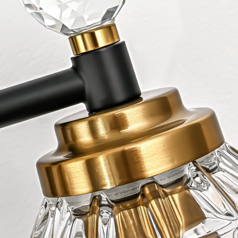 Illuminate your powder room or en suite in a chic and sleek style with this glamorous black gold bathroom vanity light. Crafted of metal in a polished black gold finish, this dapper design showcases an elegant rounded backplate, while a curvy horizontal arm is accented by three crystal ball finials. The bell-shaped shades made of faceted glass round out the design, diffusing bright light throughout your space. This dimmable light can be mounted upward or downward for versatility and is compatible with different bulb styles and color temperatures to create various atmospheres.