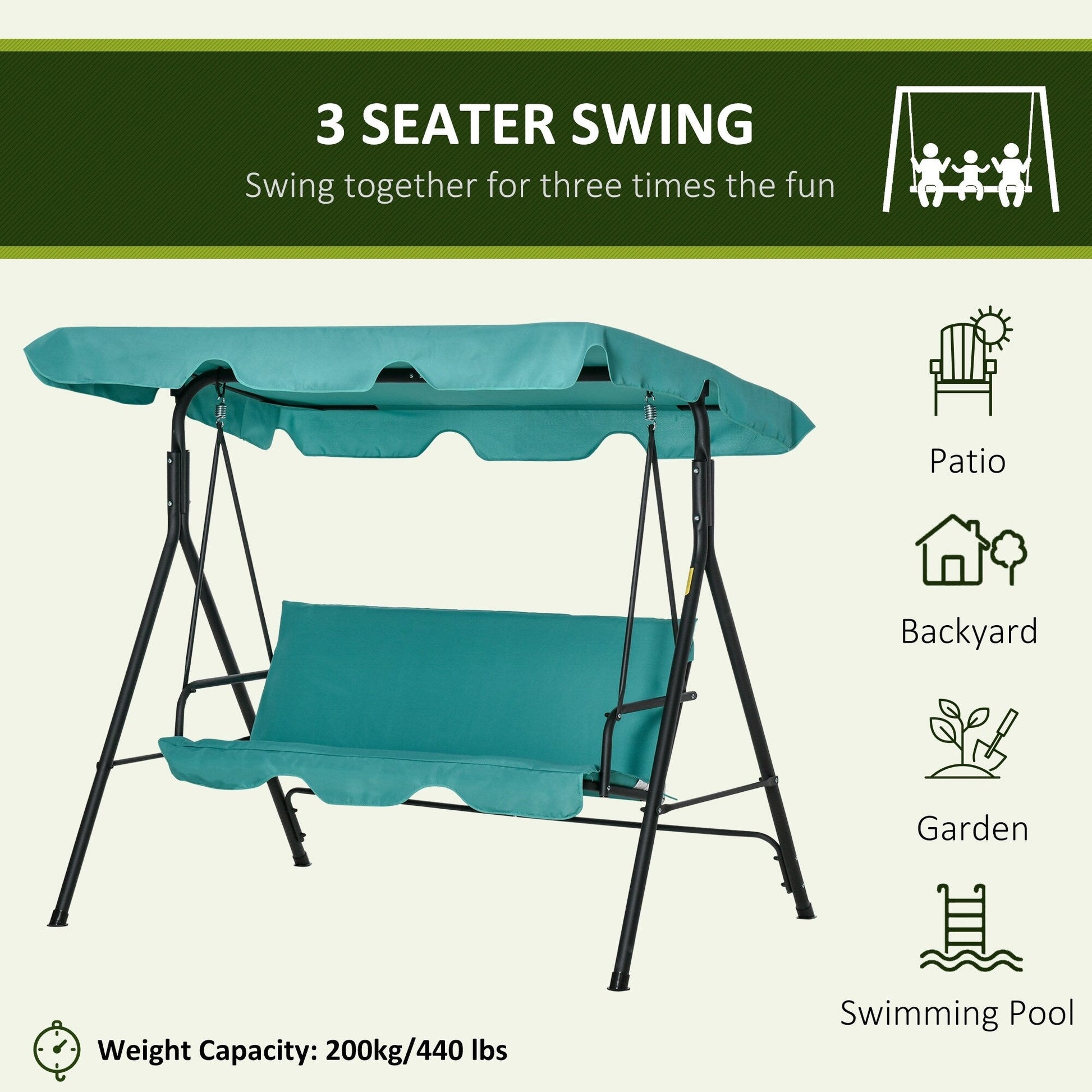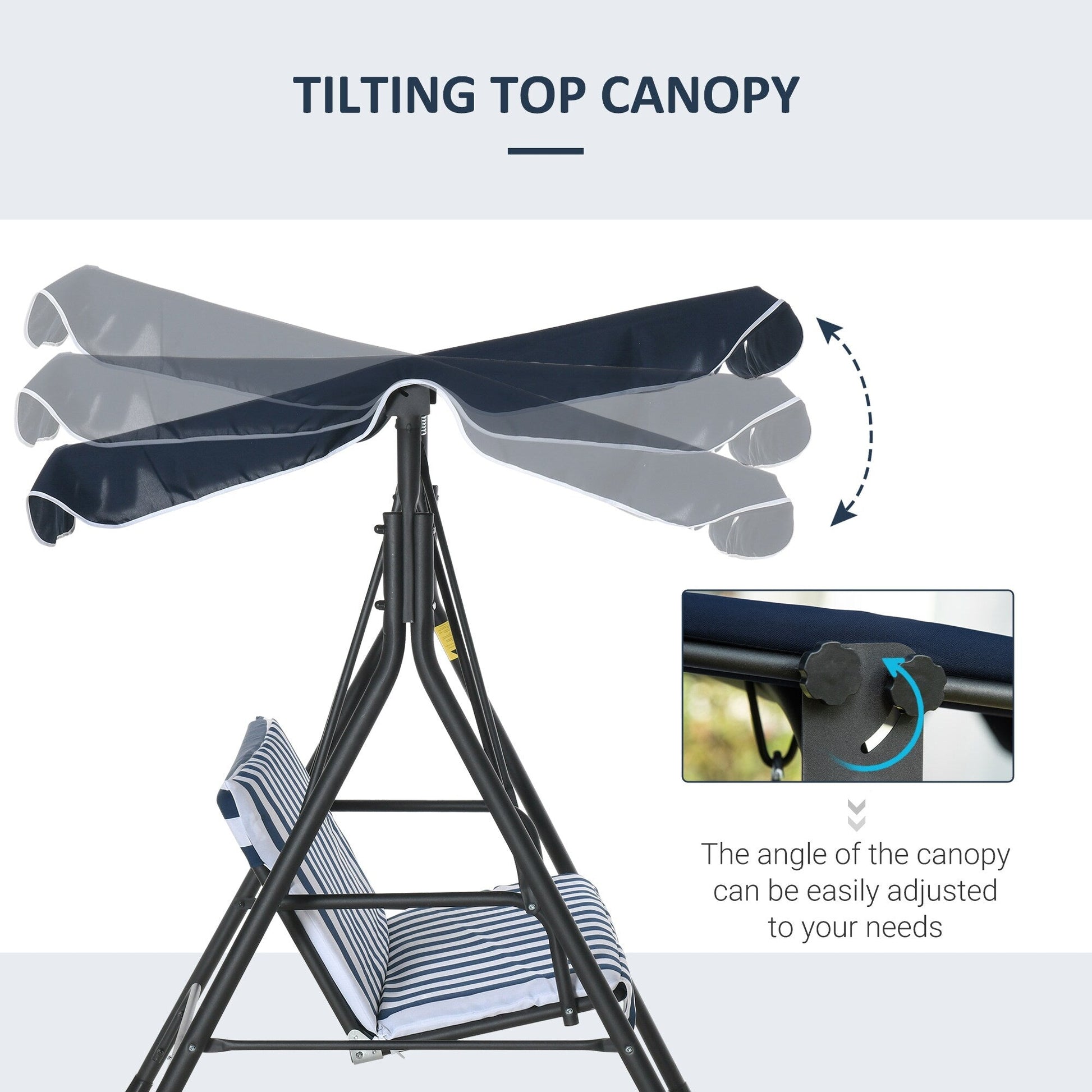 Swing through the summer on an Outsunny patio swing. Made with a heavy-duty steel frame crafted into a stable A-shape, and featuring soft, thick cushions, it seats three adults. Place it in outdoor spaces like the porch, by the poolside, garden, backyard, or on the balcony. It features an adjustable canopy that lets you swing even if there's light rain. Tilt the top so you can stop sunburns and get rid of glare. Enjoy gently swaying in the breeze with a friend; summer's going to be great.