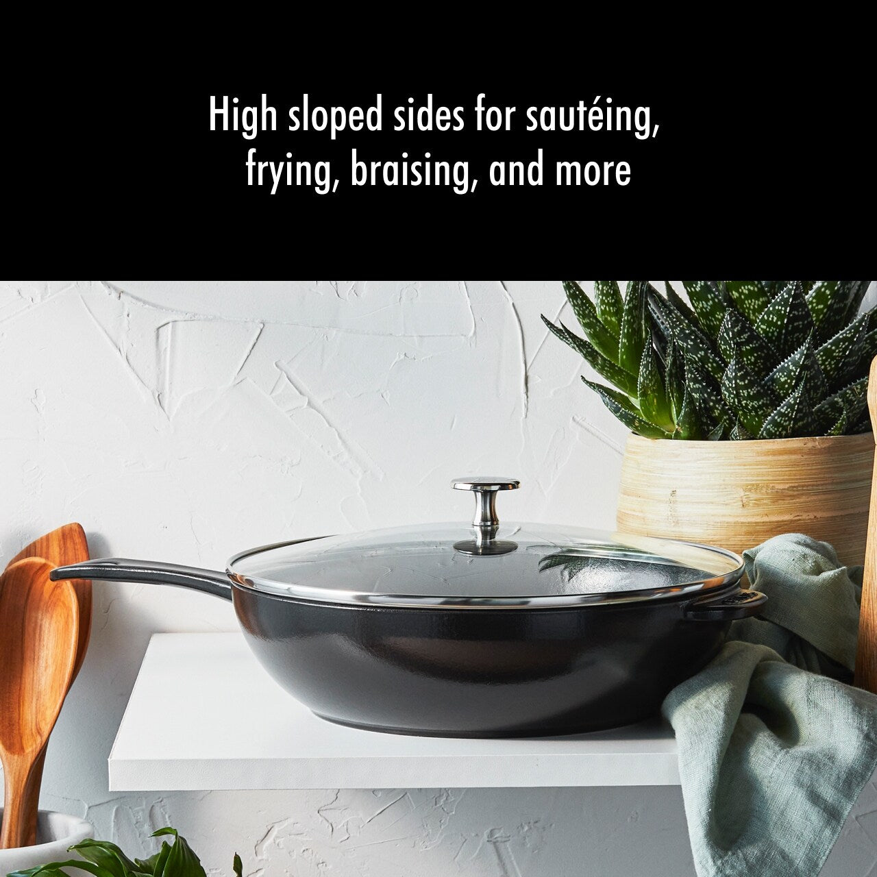 Cette poêle de 2,9 litres avec couvercle en verre trempé est l'ustensile polyvalent par excellence. Ses bords fortement inclinés la rendent idéale pour faire sauter, frire, braiser et bien plus encore, et elle est parfaite pour les plats dorés à la poêle et cuits au four. Son couvercle en verre épais retient l'humidité pour des résultats savoureux, et vous permet de surveiller la cuisson sans avoir à retirer le couvercle. La fonte possède d'excellentes propriétés de rétention de la chaleur, permettant une cuisson uniforme. Et au moment de servir, vous pouvez apporter cette élégante poêle directement à table.