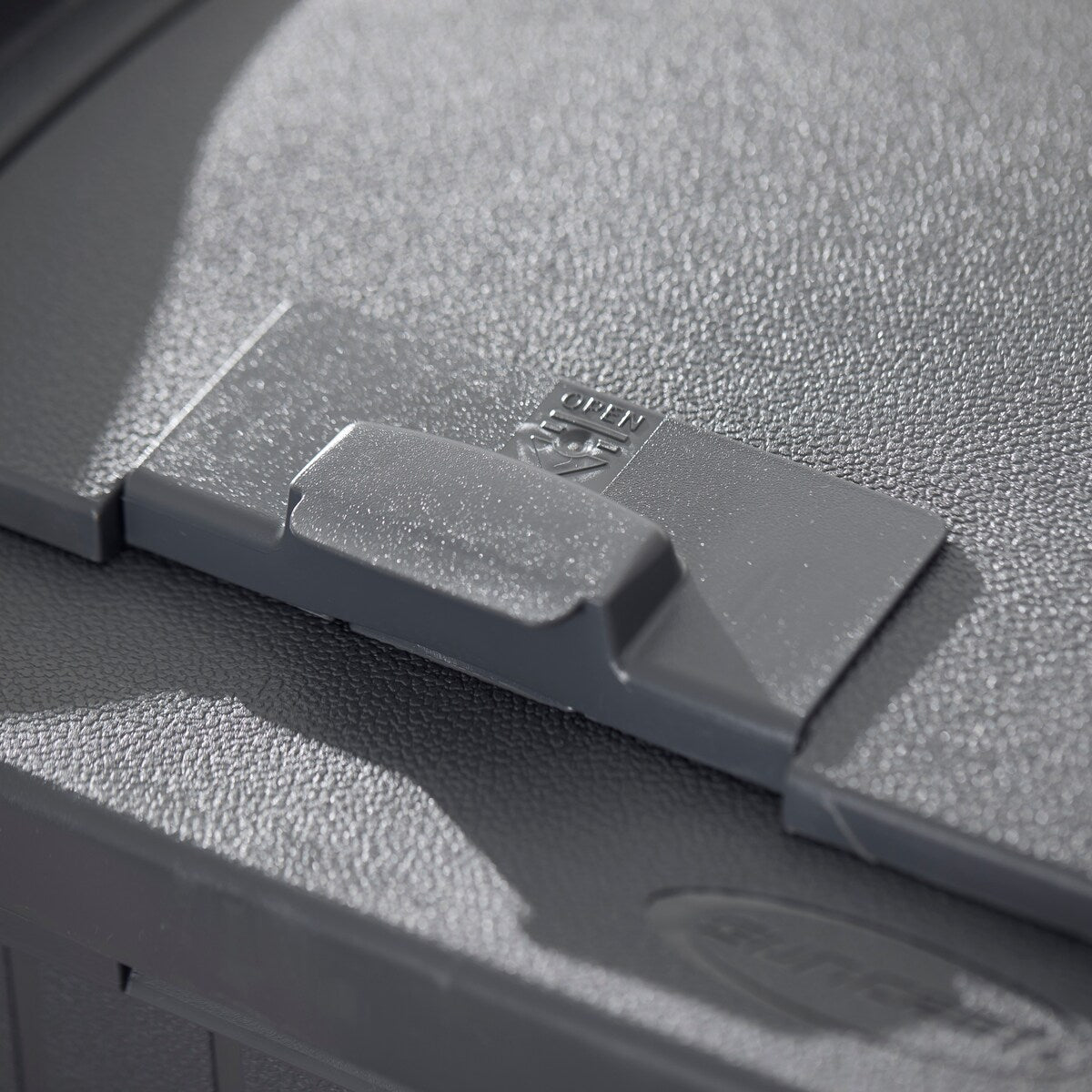 - Built with a secure latching lid to keep the trash inside and protected from the elements and unwanted critters